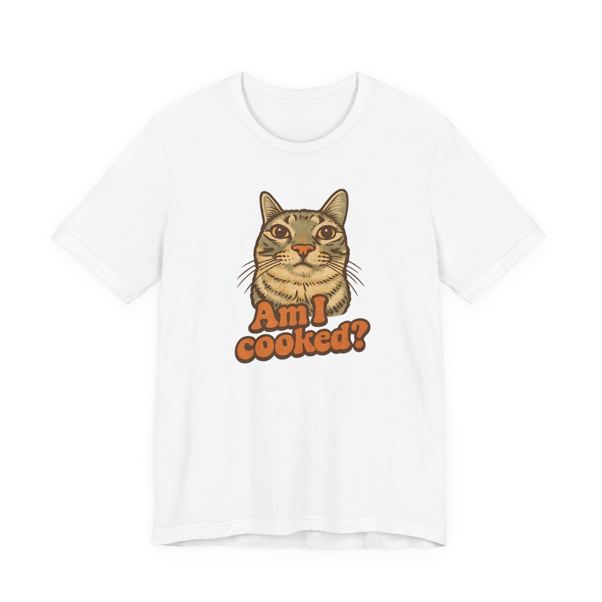 This funny cat t-shirt with the title 'Am I Cooked' is perfect for cat lovers with a sense of humor. It adds a playful and lighthearted vibe to your outfit, making it a great conversation starter. Ideal for casual wear and lounging around, this t-shirt is a must-have for cat enthusiasts looking to inject some fun into their wardrobe. Perfect for cat-themed parties, casual Fridays, and movie nights with friends.